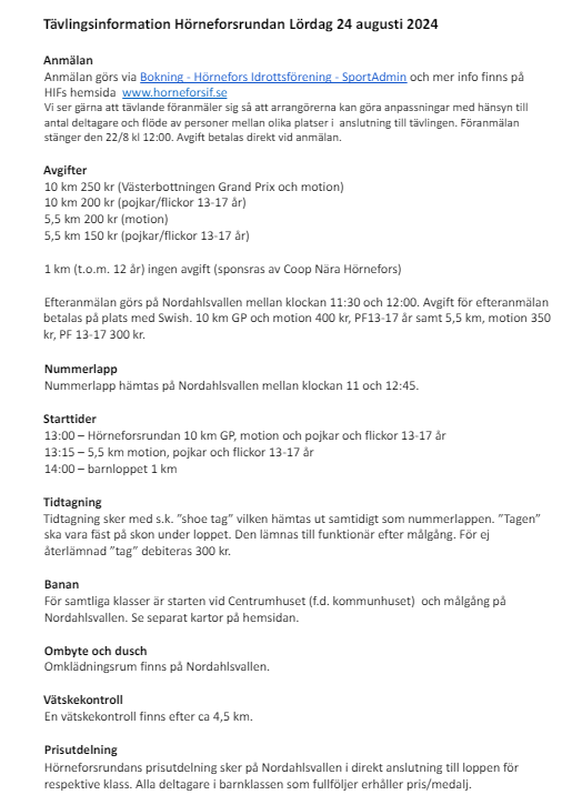 Tävlingsinformation Hörneforsrundan Lördag 23 augusti 2025